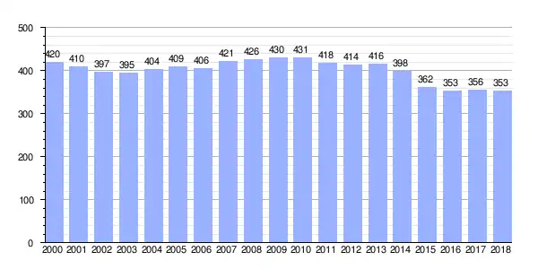 | Gráfica de evolución demográfica de Moeche[2] entre 2000 y 2018 |