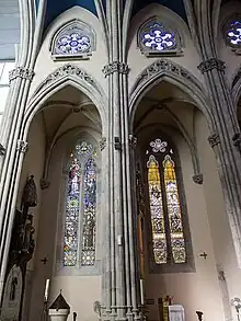 Las cristaleras recuperadas a la restauración del 2007, han respetado los dibujos y las formas originales, pero han cambiado los santos que aparecen. Se han recuperado las figuras de Antonio María Claret y Santa Lucía. En la roseta superior se ha cambiado Raimundo de Peñafort por el papa Juan XXIII.[1]