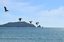 Pelícanos sobrevolando la playa de San Patricio-Melaque en enero . En el estado de Jalisco (México).