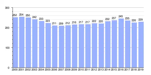| Gráfica de evolución demográfica de Sarandón entre 2000 y 2019 |