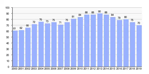 | Gráfica de evolución demográfica de Noal (parroquia) entre 2000 y 2019 |