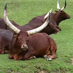 ![]() Ejemplares de la raza Ankole-Watusi, posiblemente la más llamativa de las que componen el grupo de razas de vacunos Sanga. | ||