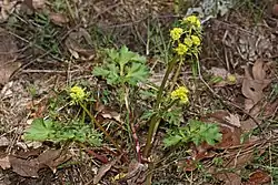 Es una planta perenne, herbácea que produce un delgado tallo ramificado de hasta medio metro de altura a partir de una raíz principal. Las hojas son compuestas, las hojas cada una dividida en tres lóbulos, los foliolos profundamente dentados. La hierba es verde y púrpura con tintes de color púrpura. La inflorescencia está formada por una o más cabezas bisexuales y una única masculina con flores pequeñas, curvadas, con pétalos amarillos. Cada cabeza tiene una serie de estrechas y dentadas brácteas en su base. Los frutos son redondeados de unos pocos milímetros de largo, cubierto de espinas curvas, y en racimos pequeños.