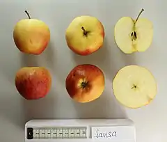 ![]() La variedad de manzana 'Sansa' con secciones cruzadas. | ||