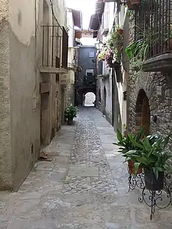 Citado ya en 1050, conserva intacto el núcleo medieval formado por una calle con una plazoleta, que se puede cerrar con un portal dotado de aspilleras, y termina en el otro extremo en la iglesia de origen románico del mismo nombre del pueblo, reconstruida varias veces con una fachada actual del siglo XVII.