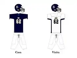 ![]() Logo Uniforme de Visita ![]() Logo Uniforme de Casa Los Bulldogs visten dos uniformes, cascos color azul Marino con una "B" estampada en el lado del mismo. El uniforme de visita, consiste en un jersey blanco con números impresos en blanco y dorado, pantalones blancos y medias azul marino. Para juegos de casa, jersey azul marino con números en blanco y dorado, pantalón blanco y medias Azul Marino. |