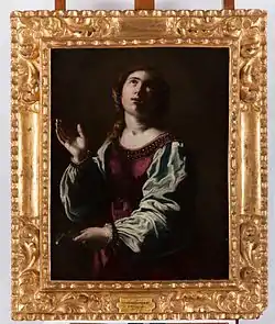 En esta, la artista italiana retrató a Santa Apolonia, mártir fallecida en Alejandría en Egipto, a mediados del siglo III tras un levantamiento violento contra los cristianos.[2] El retrato a mezzo busto y con un fondo en marrones oscuros, muestra a la santa mirando hacia arriba, como hacia el cielo; su palma derecha se encuentra extendida a forma de oración, mientras que en su mano izquierda porta unas pinzas que sostienen una muela, atributo iconográfico que ayuda a la identificación de la mártir.[3]
