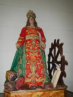 | Patronazgo | Filósofos, estudiantes, sombrereros, barberos, oficios relacionados con las ruedas; la ciudad de Jaén; el pueblo de Espeluy; la villa de Berlanga de Duero en Soria; la villa de Portonovo en Pontevedra; Majadahonda en Madrid; Tacoronte en Tenerife; Usulután (El Salvador); Pedasí (Panamá) Santa Catarina Pinula (Guatemala)Catarina Nicaragua | |