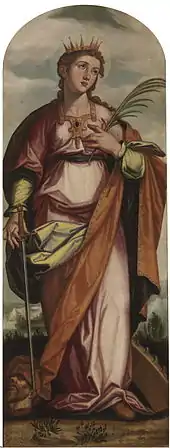 | Atributos | la palma, la espada y la rueda arpada, todas indicativas del martirio; la corona, por alusión a la realeza; el libro, como símbolo de sabiduría | |