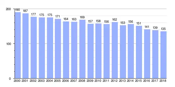 | Gráfica de evolución demográfica de Moeche[2] entre 2000 y 2018 |