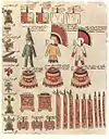 Sigue: Ontzontli ichtilmatli, es decir, 800 mantas de henequén. En español se asentó solamente: “Mantas 800”. Los tres tipos de vestiduras, con sus respectivas rodelas, llevan señalados en dos de ellas el numeral 20 (cempantli) como cantidad a pagar. En español se inscribió entre ellas: “Adornos o vestidos”.