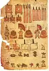 En la siguiente línea, a la izquierda, aparecen tres cargas de leña dispuestas ya en su cacaxtli o instrumento para cargar. Su glosa en náhuati es la siguiente: Yetzontecpantli cudhuitl in tiatiloni, o sea: “Mil doscientas cargas (24.000 unidades) de maderos para quemar”. Y en español: “1.200 tercios de leña para quemar”. Arriba, dos cuezcomates contienen frijol, maíz y chía o huauhtli. A la derecha, el tributo de tres tipos de madera semilabrada: Yetzontecpantli huepantli, igual a 1.200 cargas de vigas grandes desbastadas. Arriba, la glosa en español dice solamente: “Vigas labradas”. Yetzontli xopétlatl, que se traduce por 1.200 tablones para pisos. Y arriba, en español: “Planchas de madera”. Yetzontli cuauhmimilli, o 1.200 pilares de madera. Y abajo, en español: “Morillos”.