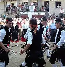 A las doce de la mañana el alegre repiqueteo de las campanas anuncia a todos que llegó la Fiesta Mayor. En las casas todo son prisas, hay que hacer las faenas y hay que arreglarse a tiempo para la misa. Ya se oye en las calles a Eduardo el tamborilero y las castañuelas del maestro Manuel de Arriba al frente de los mozos y mozas que danzarán este año. Con sus deslumbrantes trajes serranos, castañuelas y palos de danzar, acompañados por Alcalde y miembros de la comisión marchan a recoger en sus casas, a Damas de honor y Reina de las Fiestas para dirigirse todos a la misa Mayor. Hay en el pueblo y en las calles una mezcla de alegría, colores, música decastañuelas y tamboril que tiene su momento culminante en la llegada a la iglesia. Las mujeres entran primero, los hombres ocuparán la parte final. El templo ha sido primorosamente enga- lanado días antes por fervorosas mujeres, utilizando antiguos tapices y esmerados ramos de flores. Después de misa solemne, Bajo el emocionante repicar de las campanas, San Agustín recorre las calles del pueblo llevado a hombros en procesión y acompañado por el Sr. Cura, autoridades y danzadores y seguido por las gentes del pueblo para culminar en la plaza donde se celebrará el Ofertorio. En esta hermosa ceremonia los danzadores ofrecen a su patrón inolvidables momentos de danza. Los ´paleos´ de hombres y mujeres se suceden, arrancando emocionados aplausos, para acabar, con el ´baile del ramo´ (“tece y destece”). Tejer con cintas de colores una espectacular trenza alrededor de un ramo, para destejerla después a ritmo de danza gaita y tamboril. .