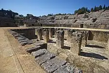El anfiteatro de Itálica tenía capacidad para 25 000 personas, y la ciudad solamente llegó a tener unos 8.000, por lo que se puede afirmar que a él acudían también personas de otras localidades y las guarniciones romanas que se encontrasen allí.[10] El graderío (cavea) estaba formado por tres niveles de gradas (ima, media y summa cavea), de las que solo se conservan parcialmente las dos inferiores. En el centro de la arena existe una fosa que, cubierta con una estructura de madera, se empleaba como zona de servicio para los espectáculos.[cita requerida]