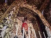 En lo que respecta al baldaquino donde se halla la escultura, circundado por pequeños querubines, cuatro ángeles de gran tamaño, ubicados sobre cuatro columnas salomónicas de más de cinco metros de altura decoradas con hojas de vid, racimos y pámpanos, se apoyan sosteniendo un arquitrabe con una mano sobre la cadera y sujetando la cornisa de la estructura con la otra.[2] Las gradas se encuentran adornadas con un juego de altar de plata y una serie de ramilletes de plata repujada adquiridos en Salamanca en 1747, mientras que en el fondo, a ambos lados de la imagen del Santo Cristo, hay dos pequeñas cornucopias de estilo rococó con espejos y soportes para colocar tres luces.[2]