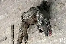 El caimán atacó y devoró a numerosas víctimas hasta que un cojo se ofreció para acabar con el animal. Estudió previamente el comportamiento del caimán para luego esperarlo en un árbol con su muleta y un pan abogado. El olor a pan despertó el hambre del caimán que enseguida abrió la boca para engullirlo. El cojo aprovechó ese preciso instante para clavarle su bastón entre las mandíbulas abiertas y luego matarlo. Una vez disecado se colocó el reptil como exvoto en el patio del santuario donde también se conserva aún el bastón que causó la muerte del animal.[7]