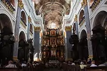El altar fue realizado entre 1712 y 1714 por los mejores escultores de Polonia en ese momento. El objeto, compuesto de tres partes principales o plantas, está adornado con figuras doradas de santos y mártires. Juan III Sobieski regaló una pintura a los jesuitas después de su victoria en la Batalla de Viena y luego se incorporó al retablo.[10]