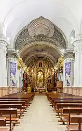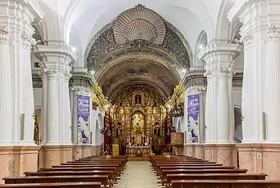 Tiene una planta rectangular con tres naves, más ancha y alta la central, divididas en cinco tramos, a las que se adosa cabecera tripartita, compuesta a su vez por la capilla mayor y dos colaterales, todas ellas rectangulares. A esta cabecera se adosan la sacristía y otras dependencias del templo. En el camarín del altar mayor es donde se encuentra la imagen sedente de santa María de África, la talla aparece con Jesucristo muerto en sus brazos y coronada con una corona imperial y ricos mantos bordados en oro. Dichos mantos les son cambiados a diferentes colores según los tiempos litúrgicos.