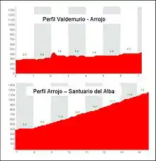 También desde el punto de vista del cicloturismo, el ascenso al santuario tiene su atractivo, ya que la subida tiene curvas en herradura, pendientes importantes, cambio de paisajes continuo. Con bici de montaña pueden hacerse los últimos cuatro km solo para cicloturistas de buena condición física y dominio de la bici en caminos de tierra y pedregosos. Con la bici de carretera hay que renunciar a hacer estos km sobre ella. La altimetría que se adjunta demuestra lo dicho.[5]