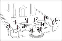 En los tres planos del atrio, esculturas ordenan sus gestos simétricamente respecto al eje principal de la composición. Abriendo la representación, están Jeremías e Isaías de frente y, detrás de ellos, en el primer rellano, Baruc y Ezequiel. En el balcón del atrio están, de perfil, Daniel y Oseas. Más adelante, Jonás y Joel se dan las espaldas, y por fin, en los ángulos curvilíneos del patio, Abdías y Habacuc levantan los brazos. En las extremidades del arco, Amós y Nahum se presentan de frente.