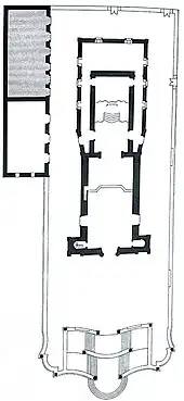 El edificio tiene una única nave central amplia que desemboca en una capilla central en la que se encuentra el altar. A ambos lados de la estructura central, se encuentran dos altas torres de campanario, situadas en segundo plano respecto de la línea principal de la fachada y coronadas con cúpulas similares a las de otras capillas, aunque de menor tamaño. La fachada se compone de un cuadrado sencillo que se abre a través de un portal con jambas delicadamente decoradas y dos ventanales. La parte superior culmina en un frontón con una silueta ondulante. En su parte exterior, el complejo está enlucido con yeso blanco, excepto los relieves de esteatita que delimitan el perfil del parapeto de la escalera, las esquinas de las torres, los voladizos que marcan una separación entre la parte principal de la fachada y el frontón, los relieves del portal y el propio frontón. Los motivos decorativos se repiten en una forma levemente más sencilla en las capillas.[7]