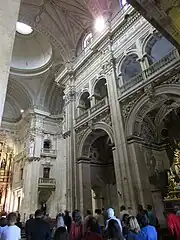 Se organiza según una planta de cruz latina que decora su interior con grandes pilastras corintias. Cuenta con tres naves, quedando la central cubierta por una bóveda de crucería, mientras que el crucero lo hace a través de una cúpula de inferior calidad que el resto del edificio. A cada lado de las bóvedas se abren tres capillas y, encima de ésta, tribunas, repetidas en el crucero