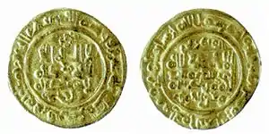 Dinar de oro acuñado en 1029 por Yahya al-Muzaffar como rey taifa de Zaragoza.