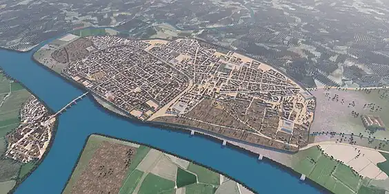 Saraqusta en 1118, vista desde al-Jazíra (la Isla), donde Abderramán III acampó en 935 para sitiar la ciudad.