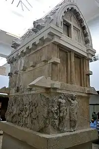 Este sarcófago de piedra, imita la caja de madera en la que normalmente se colocaba a los difuntos y está formada por una tumba inferior, un zócalo macizo y el sarcófago propiamente dicho con su tapadera. Reproducía la estructura de la casa licia con vigas de madera y techo esbelto de vertientes combadas.