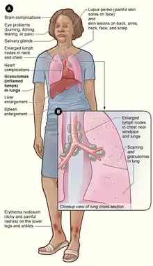 La enfermedad puede manifestarse en cualquier órgano del cuerpo, con mayor frecuencia en el pulmón y ganglios intratorácicos. También son frecuentes las manifestaciones oculares, cutáneas y hepáticas.