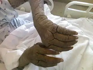 La sarna noruega, también llamada sarna costrosa o sarna hiperqueratósica, es una forma de presentación clínica de la sarna que fue descrita por primera vez en 1884 por los médicos noruegos Danielssen y Boek. Está provocada por el parásito Sarcoptes scabiei var. hominis, el mismo agente infeccioso que provoca la sarna común humana, pero se diferencia de esta en la presentación clínica, ya que se produce una respuesta inmunitaria anómala del huésped infectado, lo que hace que el parásito se multiplique con gran rapidez en la piel del individuo afectado, provocando una infestación masiva con más de 1000 ácaros por cm² de piel. La capacidad de contagio es muy alta, por lo que es frecuente que se produzcan brotes desencadenados por un solo individuo afectado, sobre todo en hospitales y residencias de ancianos o enfermos crónicos, aunque los casos secundarios suelen ser de sarna común. Están especialmente predispuestos a presentar sarna noruega las personas con déficit de inmunidad, los afectados por leucemia o linfoma, enfermos de SIDA, pacientes con enfermedades crónicas debilitantes y personas que han sido sometidas a trasplante de órganos. La forma de presentación de la enfermedad es diferente a la de la sarna común, apareciendo placas costrosas que provocan poco picor y están diseminadas por el tronco y extremidades, predominando en manos y pies, el aspecto de las lesiones puede recordar a otras enfermedades de la piel lo que dificulta el diagnóstico.[1][2]