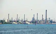 Chemical Valley y sus alrededores albergan 62 instalaciones y refinerías.[65] Estos complejos industriales son el corazón de la infraestructura y la economía de Sarnia. Ellos emplean directamente a casi 8,000 y contribuyen a casi 45,000 empleos adicionales en el área.[66] En 1971, el gobierno canadiense consideró que esta zona era tan importante para el desarrollo económico del país que imprimió una imagen de una refinería de petróleo de Sarnia en el reverso del billete de 10 dólares canadienses .[67] La enorme zona industrial es la causa de una importante contaminación del aire y del agua. El estándar diario de Canada Wide para partículas en el aire y contaminación por ozono, regulación PM2.5, es de 30 microgramos por metro cúbico.[68] Cuarenta y cinco por ciento de esta contaminación del aire por partículas en Sarnia proviene de Chemical Valley,[69][70][71] y el resto se desplaza sobre el río St. Clair desde los Estados Unidos vecinos en forma de lo que se conoce como "transfronterizo". La contaminación del aire." [72]