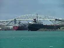 El Blue Water Bridge une Sarnia y su pueblo vecino de Point Edward con la ciudad de Port Huron en los Estados Unidos. Se extiende por el río St. Clair, que conecta el lago Hurón con el lago St. Clair. El tramo original de tres carriles del puente, inaugurado en 1938, fue hermanado el 22 de julio de 1997,[109] haciendo del puente el cuarto cruce fronterizo más transitado de Ontario.[110]
