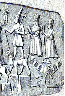 En la procesión de los dioses hititas en el santuario rupestre de Yazılıkaya, probablemente asociado con la fiesta hitita del Año Nuevo, está detrás de su madre sobre un felino, representado en la cámara B como protector y dios patrono de Tudhaliya. "El anagrama de Sarruma es la mitad inferior de un cuerpo masculino con dos segmentos oblicuos por encima del cinturón".[7] En el relieve de Hanyeri se le representa en forma de toro.[8][9] Como el doble dios Šarrumanni, Šarruma fue invocado como intermediario y protector.[10]