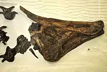![]() Montaje en panel del esqueleto holotipo de Saurolophus , AMNH 5220. | ||