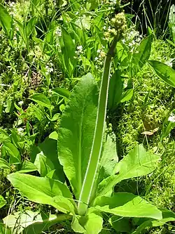 Una roseta de hojas largas y romas en forma de lanza rodea un tallo pegajoso y peludo de unos 30 a 80 cm de altura. El tallo fuerte, peludo y pegajoso posee racimos ramificados (al principio compactos, luego alargados y sueltos) de pequeñas flores de color amarillo verdoso. Las flores de cinco pétalos se encuentran en tallos cortos desde la parte superior del tallo y pueden ser blancas, verdes, amarillas o moradas.