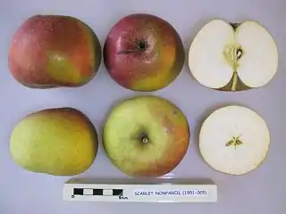 Scarlet Nonpareil es el nombre de una variedad cultivar de manzano (Malus domestica).[1][2][3] Un híbrido de manzana de Parentales desconocidos. Criada alrededor de 1773 en el jardín de una posada en Esher, Surrey. Recibió el Premio al Mérito de la Royal Horticultural Society en 1901. Las frutas tienen una pulpa blanca fina y cremosa con un sabor subácido y rico.[4]