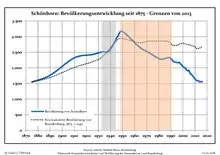 Desarrollo de la población en los actuales límites (Línea azul: Habitantes -- Línea de puntos: Comparación con el desarrollo de Brandenburgo; Fondo gris: Período del gobierno nazi -- Fondo Rojo: Época communista)