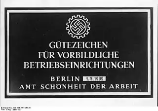 La Belleza del Trabajo (en alemán: Schönheit der Arbeit) fue una organización de propaganda del gobierno nazi desde el período de 1934 hasta su eventual disolución en 1945. Una de sus principales funciones fue el diseño del lugar de trabajo y el embellecimiento del entorno de trabajo alemán.[1] Diseñada inicialmente como una maquinaria de propaganda, el SdA trabajó bilateralmente con su organización homóloga Fuerza a través de la alegría (en alemán: Kraft durch Freude) para lograr un apaciguamiento general de la población.[2] La organización hizo campaña a favor de una limpieza mejorada, una mejor higiene, vestimenta de trabajo adecuada, vestuarios, armarios, mejor aire y menos ruido en las fábricas y otros lugares de trabajo. Esta organización fue una de las muchas áreas que conformaron el sindicato nazi, el Deutsche Arbeitsfront (DAF o "Frente Alemán del Trabajo") y fue dirigida por Albert Speer.[3]