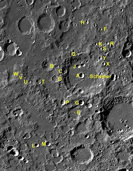 Por convención estos elementos son identificados en los mapas lunares poniendo la letra en el lado del punto medio del cráter que está más cercano a Scheiner.