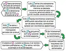 El comportamiento pre-copulatorio del macho está formado por siete pasos comportamentales (Detección de la hembra, Sacudidas, Desplazamiento, Quietud, Tamborileo palpar, Movimientos abdominales, Intento de monta), distribuidos en dos fases: una primera fase provocada por la feromona sexual femenina que finaliza con la detección de la hembra, y una segunda fase provocada por la visualización o contacto directo de la hembra que culmina con la cópula.[6]