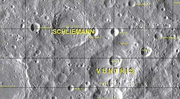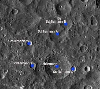 Por convención estos elementos son identificados en los mapas lunares poniendo la letra en el lado del punto medio del cráter que está más cerca de Schliemann.