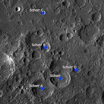 Por convención estos elementos son identificados en los mapas lunares poniendo la letra en el lado del punto medio del cráter que está más cercano a Schorr.