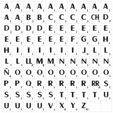Los acentos prosódicos son ignorados. Las letras K y W no están ya que se usan muy poco en palabras en español. De acuerdo a las reglas de la FISE (Federación Internacional de Scrabble en Español), una ficha en blanco no puede ser usada para representar K o W.
