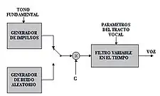 El tracto vocal se comporta como un filtro, cuyos parámetros varían en el tiempo en función de la acción consciente que se realiza al pronunciar una palabra. Se muestra el diagrama de bloques del modelo del tracto vocal. Se consideran dos posibles entradas que dependerán del tipo de señal a reproducir, sonora o no sonora. Para señales sonoras, la excitación será un tren de impulsos de frecuencia controlada, mientras que para las señales no sonoras la excitación será ruido aleatorio. La combinación de estas señales modela el funcionamiento de la glotis. El espectro de frecuencias de la Señal de Voz puede obtenerse a partir del producto del espectro de la excitación por la respuesta en frecuencia del filtro.