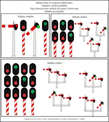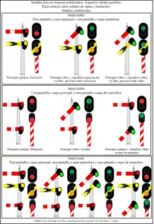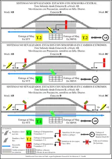 | Señalización en uso normal | Semafórica o solo manual | Semafórica con o sin enclavamiento con staff, o solo manual | Señales fijas, generalmente de aspas | Señales fijas luminosas |