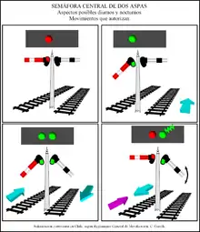 | Avance (con precaución) | Amarilla (1), movida paralelo a la vía | Amarillo, movido paralelo a la vía | Ambos brazos balanceo paralelo a la vía | Uno largo (__) | Uno |