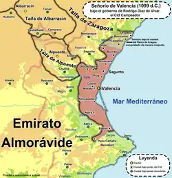 Tras su muerte el 10 de junio de 1099,[10] su esposa Jimena, convertida en señora de Valencia, consiguió defender la ciudad con la ayuda de su yerno Ramón Berenguer III, hasta mayo del año 1102, cuando el rey Alfonso VI de León, considerando las dificultades de defender Valencia el 4 de mayo de 1102[11] ordenó la evacuación de la ciudad de los cristianos, incendiándola posteriormente.[12] El día después, 5 de mayo de 1102 Valencia cayó en poder de los almorávides[13] al mando de su caudillo militar Mazdalī.