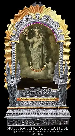 El lienzo de Nuestra Señora de la Nube acompaña a la imagen del Señor de los Milagros en su reverso, se tiene registro de que el lienzo ya acompañaba la procesión desde 1747, sin embargo se desconoce con exactitud la fecha de su confección y desde cuando fue colocada al reverso del anda. De advocación ecuatoriana, es fiel homenaje a la cuna de la fundadora del Monasterio de Las Nazarenas. Según Pedro Gjurinovic fue pintada encima de la imagen de la Virgen de la Merced, como se comprobó cuando se hizo la restauración del lienzo en el Museo de Osma.