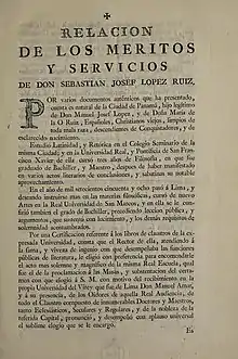 2. Paniagua, Juan Francisco (1794). Relacion de los meritos y servicios de Don Sebastian Josef Lopez Ruiz. [Madrid] : [publisher not identified]. Consultado el 16 de mayo de 2021.